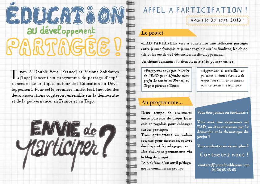 Vous êtes jeunes ou étudiants, vous avez de l’expérience en Education au Développement ou en Education à la Citoyenneté et à la Solidarité ? Que diriez vous de participer à ce projet : Lads Lyon [France] et Visions Solidaires [Togo] lancent un programme de partage d’expériences et de pratiques autour de l’Education au Développement, avec le soutien d’Etudiants et Developpement . Pour cette première année, les bénévoles des deux associations cogiteront ensemble sur la démocratie et de la gouvernance, en France et au Togo. Envie d’en savoir plus ? Contactez nous : contact@lyonadoublesens.com ou visionssolidaires@gmail.com